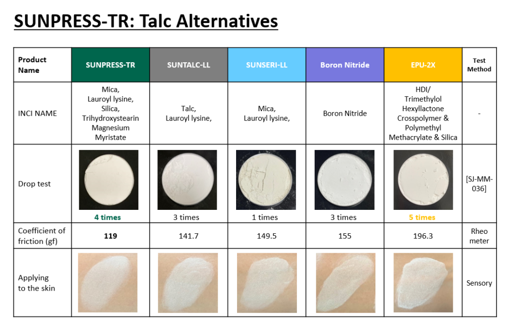 탈크 대체 원료로 개발된 SUNPRESS-TR과 이를 활용한 프레스 파우더 및 아이쉐도우 처방에 대해 자세히 알고 싶으시다면?