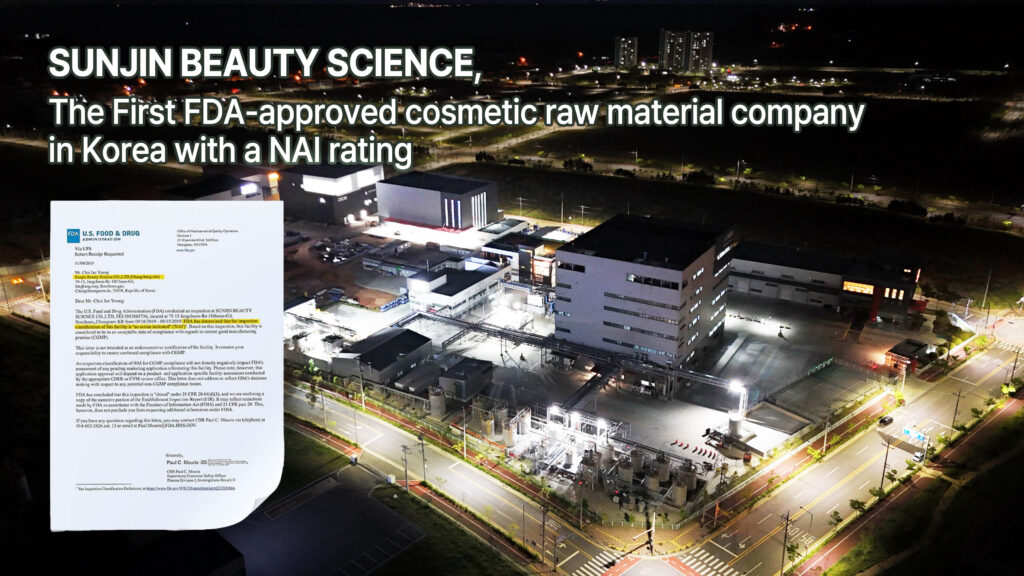 선진뷰티사이언스는 2019년, 국내 화장품 소재 기업 최초로 미국 식품의약국(FDA) 현장실사(Inspection)를 받아 무결점 등급(No Action Indicated, NAI)으로 통과하였습니다.