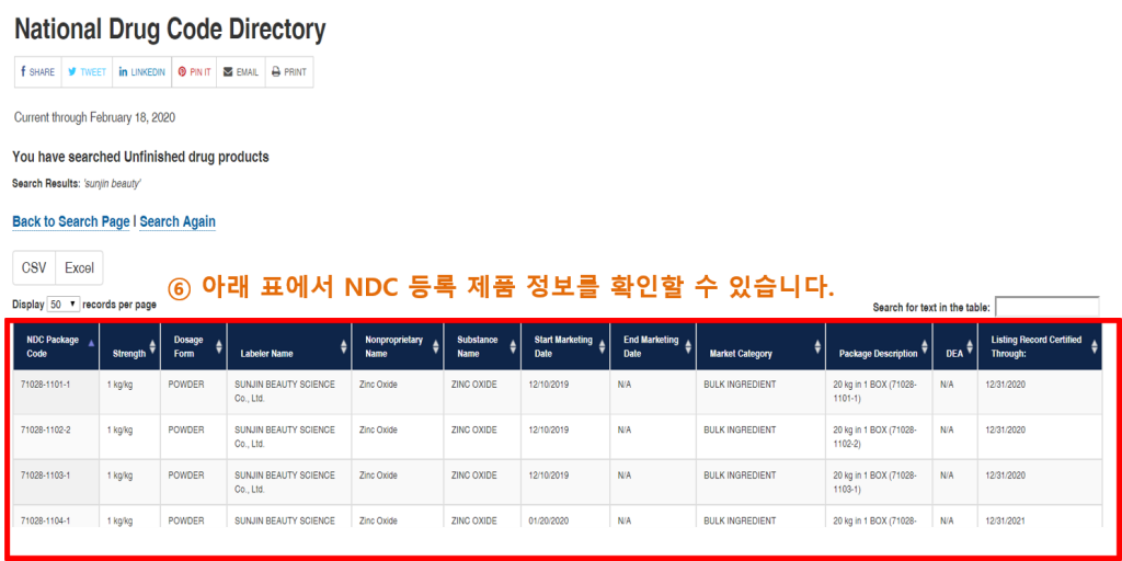 관련 사이트에 접속 후 사진과 같이 진행하시면, 아래 표와 같이 NDC 등록 제품에 관한 정보를 쉽게 찾으실 수 있습니다.