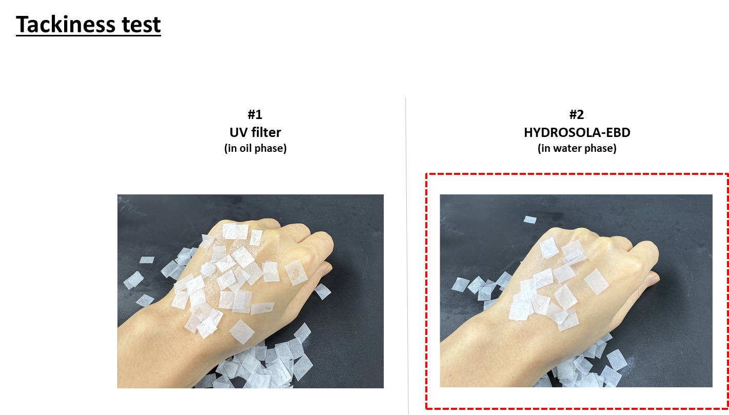 HYDROSOLA를 적용한 제형은 기존 유기 자외선 필터 기반 제형 대비 끈적이지 않는 가벼운 사용감을 제공합니다.