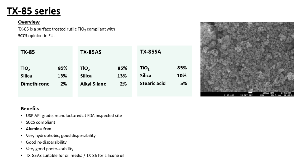 선진뷰티사이언스의 TX-85 시리즈는 나노 사이즈의 TiO2 제품으로 다양한 코팅으로 폭 넓은 선택지를 제공하여 필요에 따라 다양하게 사용하실 수 있습니다.