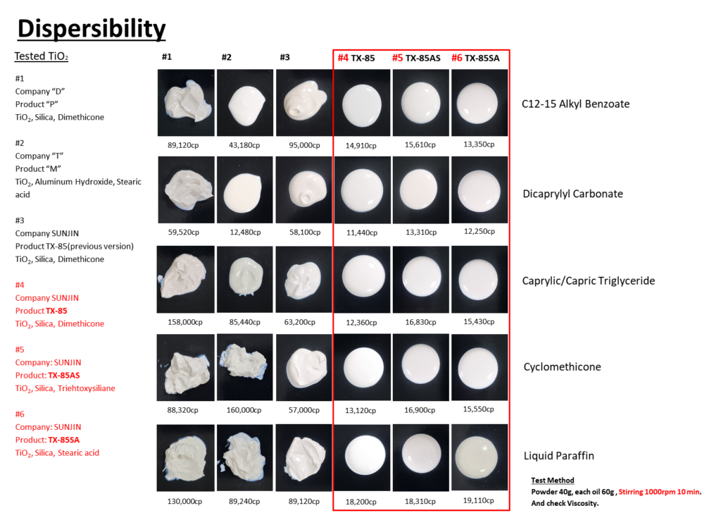 TX-85 시리즈는 광안정성이 뛰어나 Yellow index 값의 변화가 0.5~0.7 수준으로 낮게 나타납니다. 또한 점도가 낮아 타사 제품 대비 분산성이 우수하였습니다. TX-85 기존 버전보다도 더 나아진 자외선 차단 능력도 확인되어, 기존의 성능을 뛰어넘어 더욱 향상된 품질을 자랑합니다.