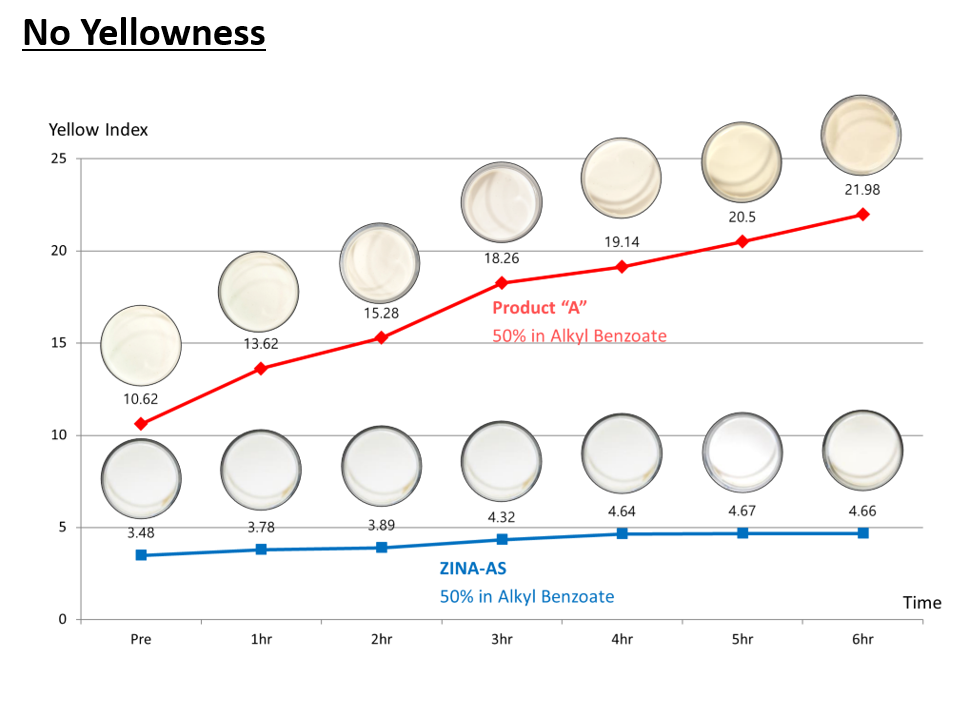 ZINA 시리즈의 또 다른 장점은 높은 자외선 차단력을 지니고 있다는 점입니다. ZINA-AS를 Alkyl Benzoate에 분산시켜 In-vitro 테스트를 진행한 결과, 눈에 띄는 강력한 자외선 차단력을 나타냈습니다.