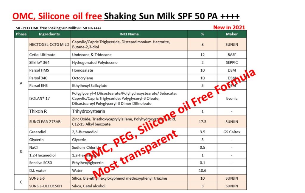 두번째 처방은 쉐이킹 타입의 SPF50 PA4+ 유무기 복합 선밀크 처방 입니다. OMC, PEG, Silicone oil Free이며 투명성이 뛰어난 처방 입니다.