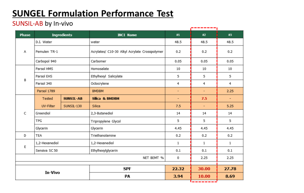 또한 SUNSIL-AB는 자외선 차단 성능이 우수합니다. 처방에 아보벤존을 따로 투입하였을 경우와 실리카 캡슐(SUNSIL-AB) 제품으로 투입하였을 경우를 비교해 보면, SUNSIL-AB를 사용한 처방의 자외선 차단 성능이 아보벤존을 따로 투입하였을 경우보다 높음을 알 수 있습니다.