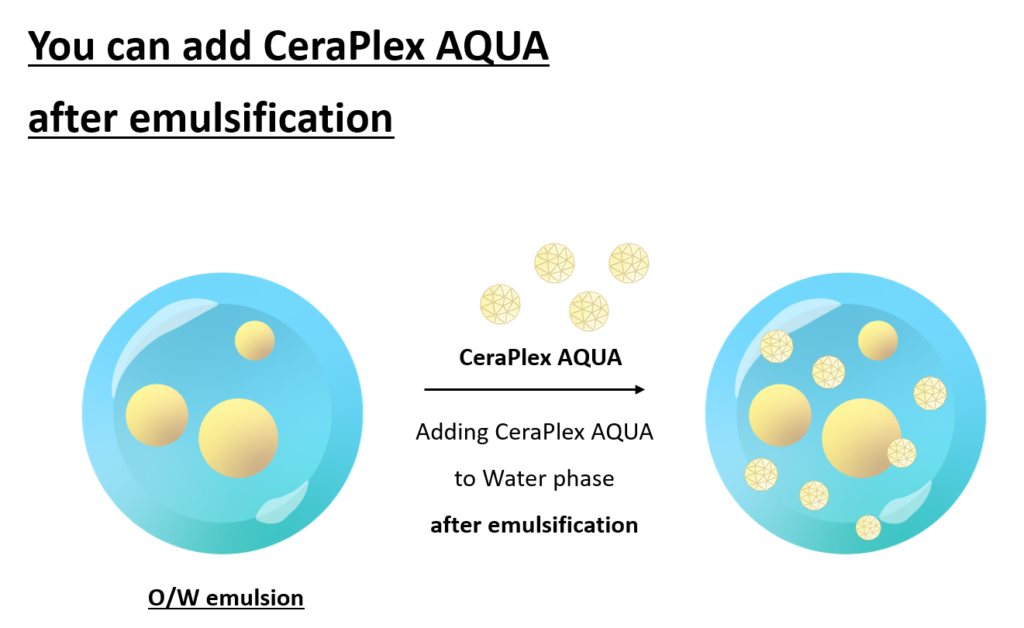 기존의 리포좀을 활용한 세라마이드 처방은 리포좀이 유화액적과 합쳐져 유화액적이 커지기 때문에 불안정해질 가능성이 있습니다. 그에 반해 Ceraplex AQUA를 사용하면 Ceraplex AQUA의 헥토라이트가 유화액적 주위를 감싸주어 더욱 안정한 처방을 만들 수 있습니다.