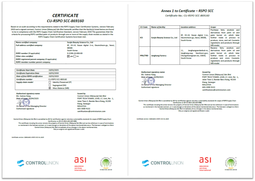 선진뷰티사이언스는 지속 가능한 경영을 실천하기 위해 RSPO 인증을 사내 정책으로 운영하고 있습니다.