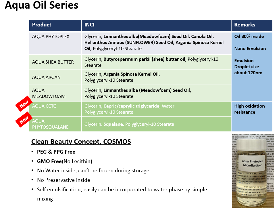 AQUA CCTG 및 AQUA PHYTOSQUALANE는 고압의 Homogenizer 및 가열 공정 없이 물에 간단히 풀어 사용하실 수 있는 나노 에멀젼 원료 입니다.