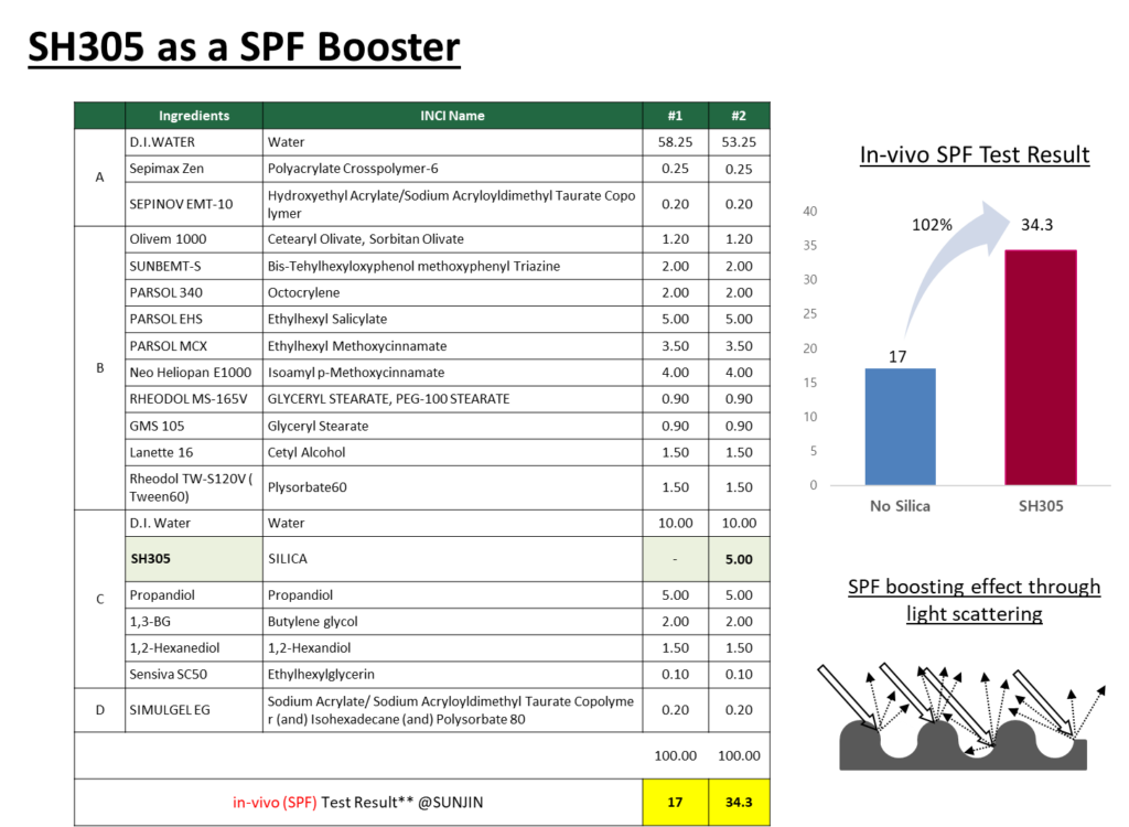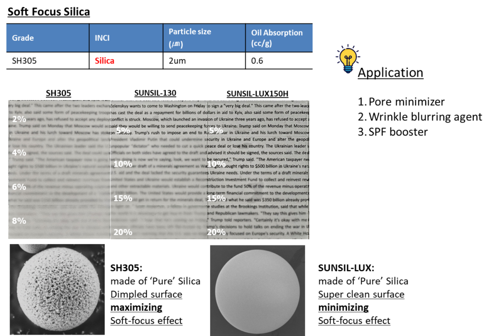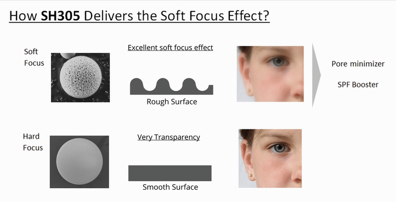 즉, SH305는 피부 표현의 미적 완성도(소프트 포커싱)와 자외선 차단이라는 기능적 니즈(SPF Booster)를 동시에 충족시키는 혁신적인 소재입니다.