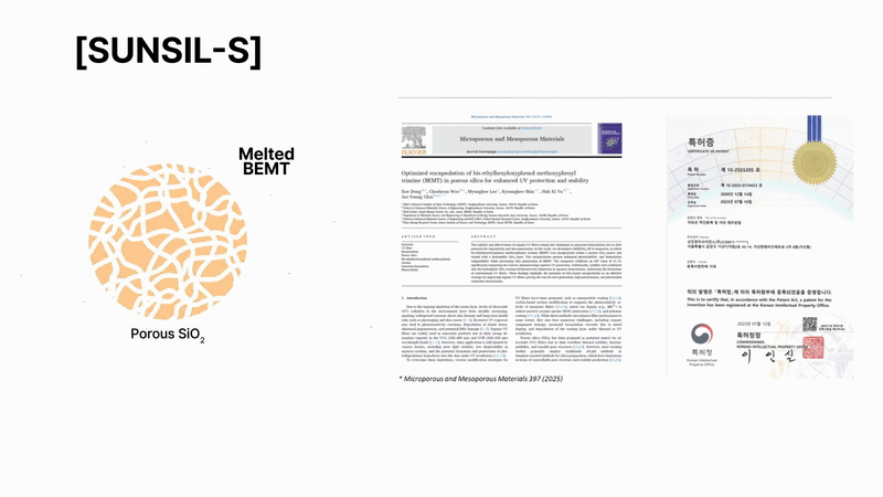 선진뷰티사이언스는 실리카 제조, 캡슐화, 코팅 기술을 기반으로 유기자외선차단제(BEMT)를 다공성 실리카에 담지한 SUNSIL-S를 개발했습니다.