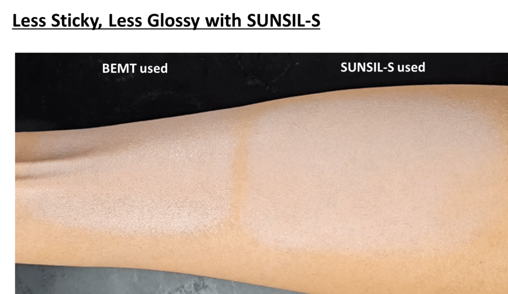 동일한 Net 함량의 BEMT를 처방에 사용하였을 때 보다 SUNSIL-S를 사용하였을 때, 자외선 차단력이 더욱 증가하였습니다. (SPF50 PA13.91 -> SPF 53.3 PA17.4) 또한 실리카 캡슐 제품을 사용함으로써 선크림의 끈적이는 사용감을 보다 효과적으로 개선 할 수 있습니다.