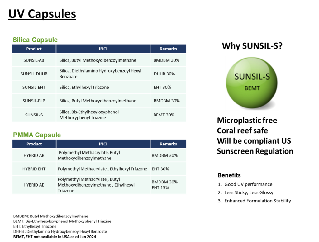 BEMT를 담지한 SUNSIL-S 이외에도 다양한 유기자외선 차단제를 실리카에 캡슐화 시킨 원료들을 최근 런칭하였으니, 선호하시는 유기자외선 차단 성분에 따라 선택적으로 사용하실 수 있습니다.
