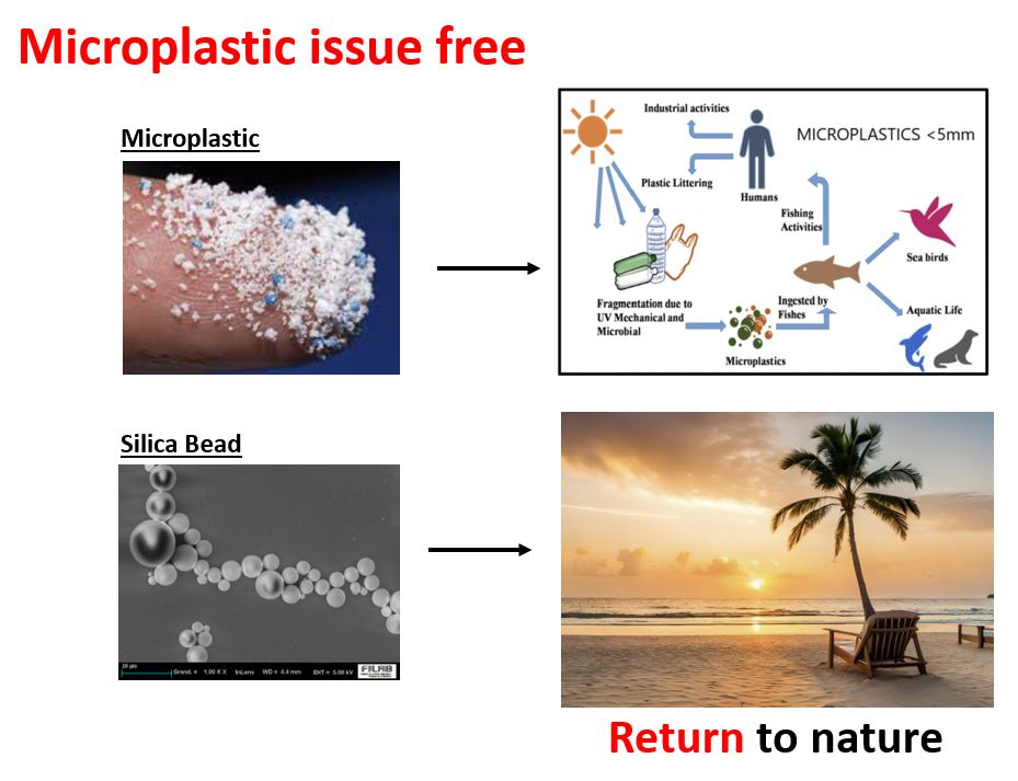 지구 환경을 위협하는 미세플라스틱 문제에 대한 대안으로 실리카가 주목받고 있습니다. 미세플라스틱은 가벼워 해양으로 흘러들어가 생태계에 축적되지만, 실리카는 상대적으로 무거워 쉽게 가라앉아 생물 흡수나 생태계 교란 위험이 낮습니다.