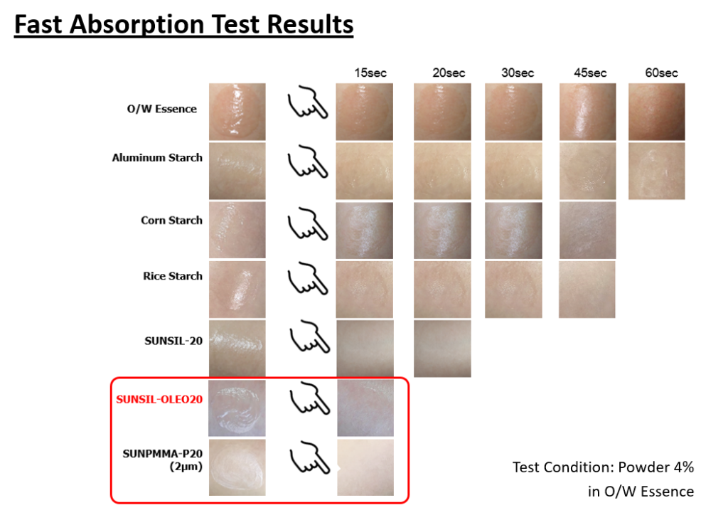 실제로 다양한 Micro bead를 사용하여 테스트 한 결과, 2um 사이즈인 SUNSIL-OLEO20 같은 표면이 소수성인 Micro bead를 사용하였을 경우 15초 안에 빠르게 처방이 흡수되는 효과를 나타낼 수 있었습니다.