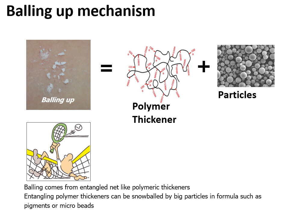 때밀림 현상이란, 그물에 공이 감긴 채 계속해서 구르며 크기가 증가하는 것처럼 처방의 피그먼트나 마이크로비드 같은 큰 사이즈 입자와 폴리머 점증제가 만나 뭉침이 발생하는 현상입니다.