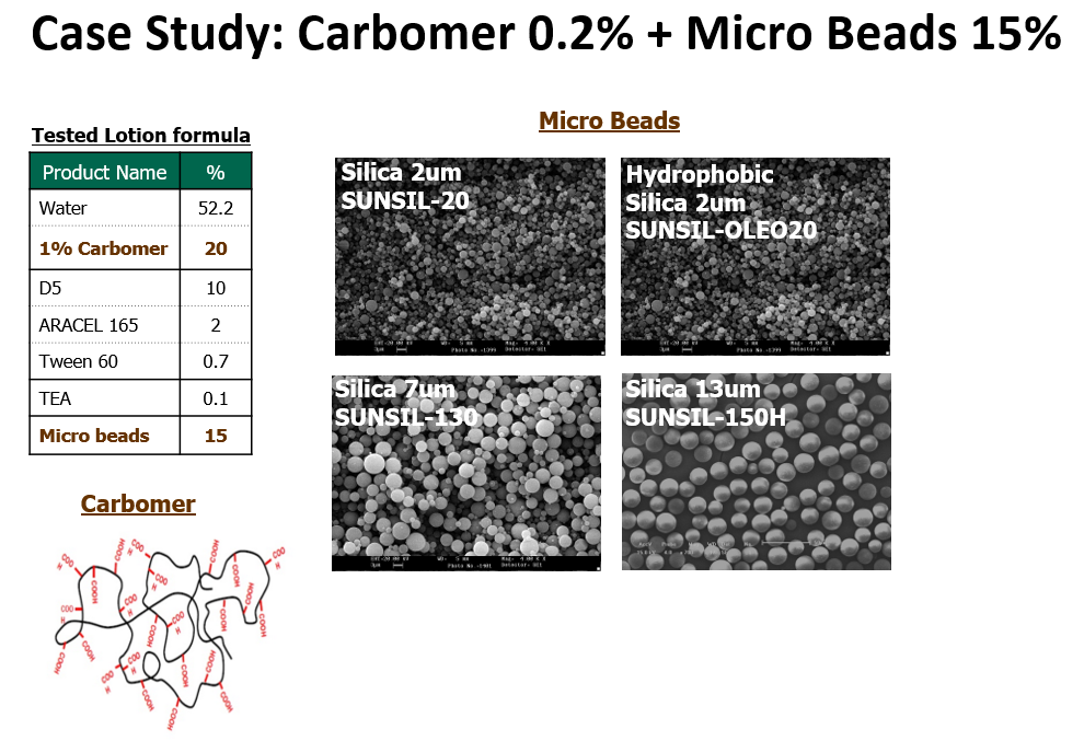 이러한 때밀림 현상을 관찰하기 위하여 카보머0.2%에 종류가 다른 마이크로비드15%를 각각 처방한 간단한 로션 처방을 제작하였습니다.