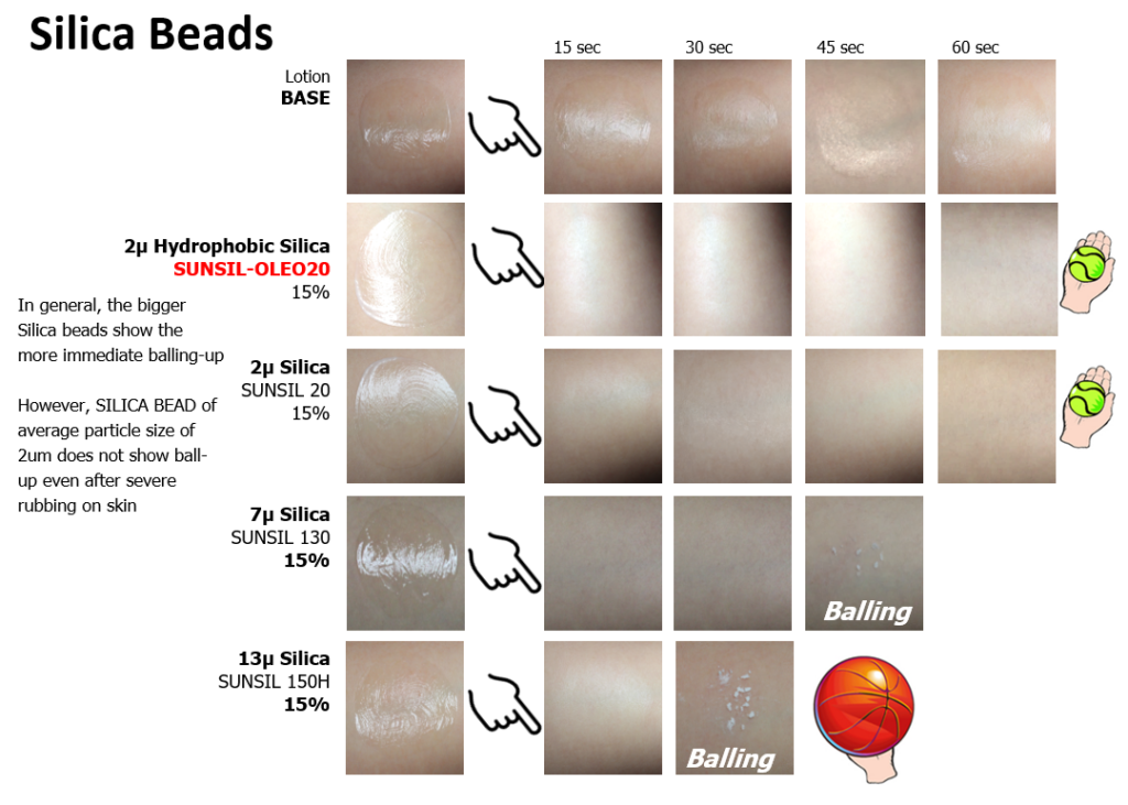 7um 사이즈의 실리카가 함유된 처방은 피부에 바른지 45초 만에, 13um 사이즈의 실리카가 함유된 처방은 30초 만에 때밀림 현상이 관찰되었습니다. 하지만 가장 작은 사이즈인 2um 실리카(SUNSIL-20 및 SUNSIL-OLEO20)이 함유된 처방은 60초 이후에도 때밀림 현상이 관찰되지 않았습니다.