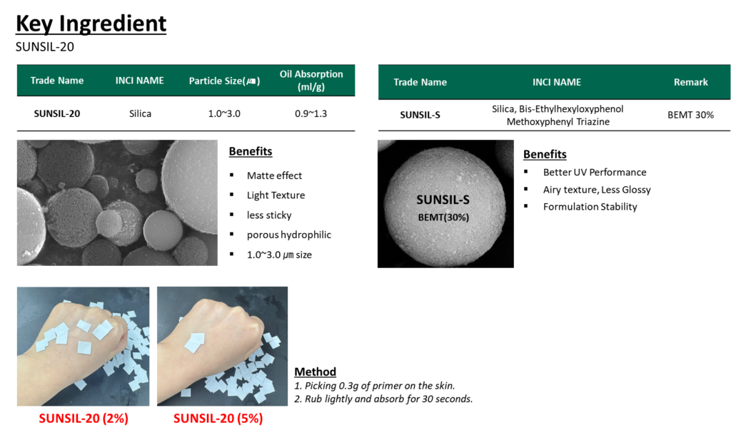 SUNSIL-20은 오일 컨트롤 및 보송한 마무리감을 제공하고, SUNSIL-S는실리카에 유기자외선차단제(BEMT)를 캡슐화하여 피부자극은 줄이고 광안정성은 향상시켜 선프라이머 기능을 한층 강화시켰습니다.