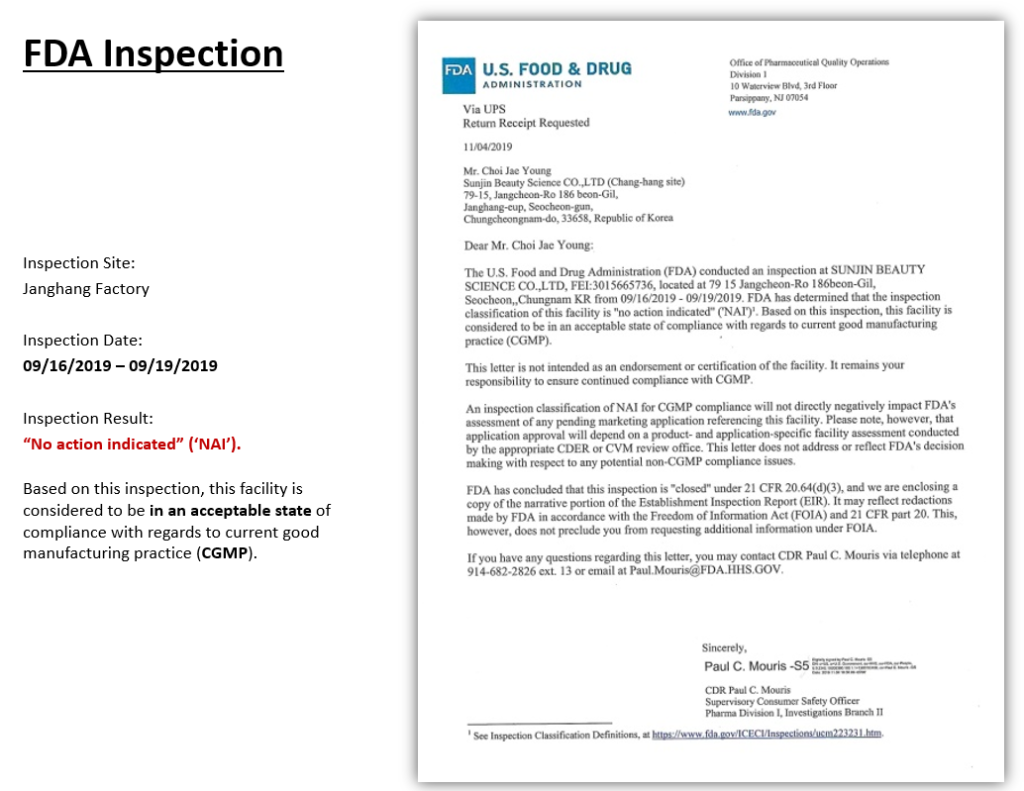 또한, SUNZnO-NAS는 FDA Inspection을 받은 API GMP 제조 시설에서 생산한 징크옥사이드 입니다. NDC(National Drug Code)를 가지고 있으며 미국에서 사용 가능합니다.