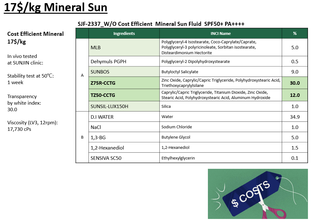 생산공정을 최소화함으로써 합리적인 가격을 가능하게 한 선진의 신제품 Z75R-CCTG와 TZ50-CCTG로 만든 SPF54, PA4+의 W/O 선크림을 직접 보고 테스트해보세요!