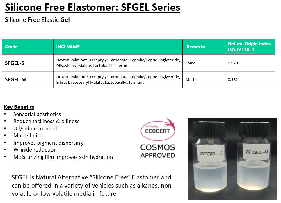 이 밖에도, 실리콘 프리 컨셉의 천연 엘라스토머 젤 제품인 SFGEL 시리즈와 균일한 ZnO 제품으로 최고의 성능과 최상의 투명성을 보여주는 ZINA 시리즈 등 다양한 신제품 및 처방에 대해 확인해보세요.