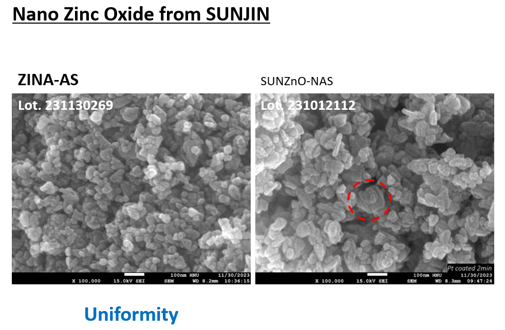 그 이유는 ZINA 시리즈가 기존의 SUNZnO-NAS나 타사의 ZnO에 비해서 균일한 사이즈를 가지고 있기 때문 입니다. SUNZnO-NAS의 경우에는 간혹 조금 더 큰 입자가 포함되어 있어 ZINA에 비해 균일성이 떨어집니다.