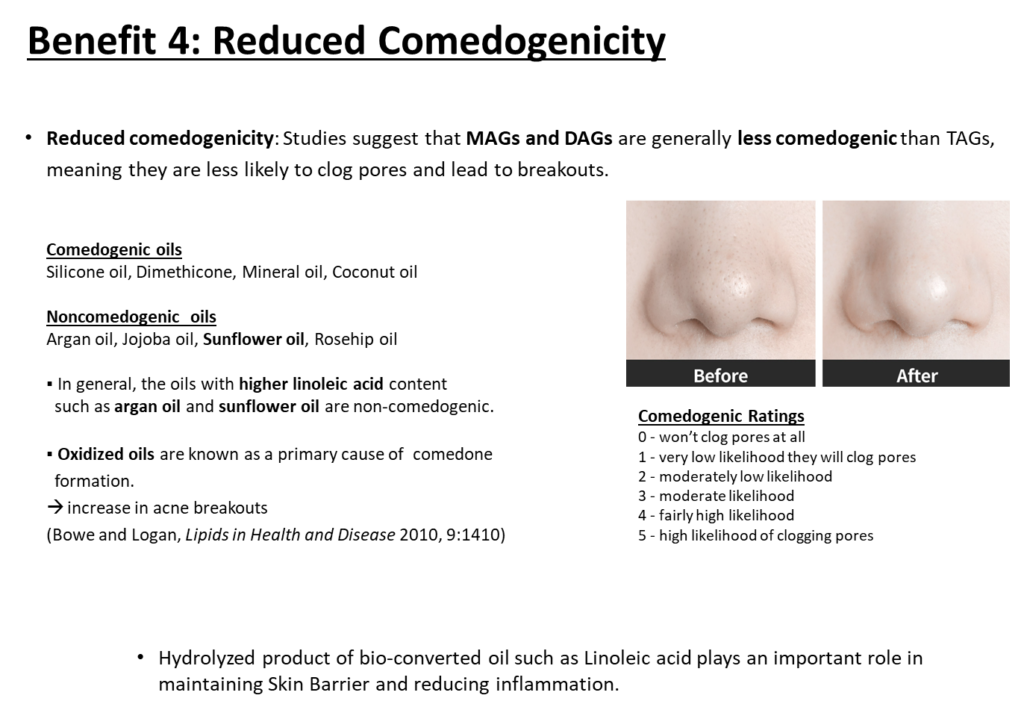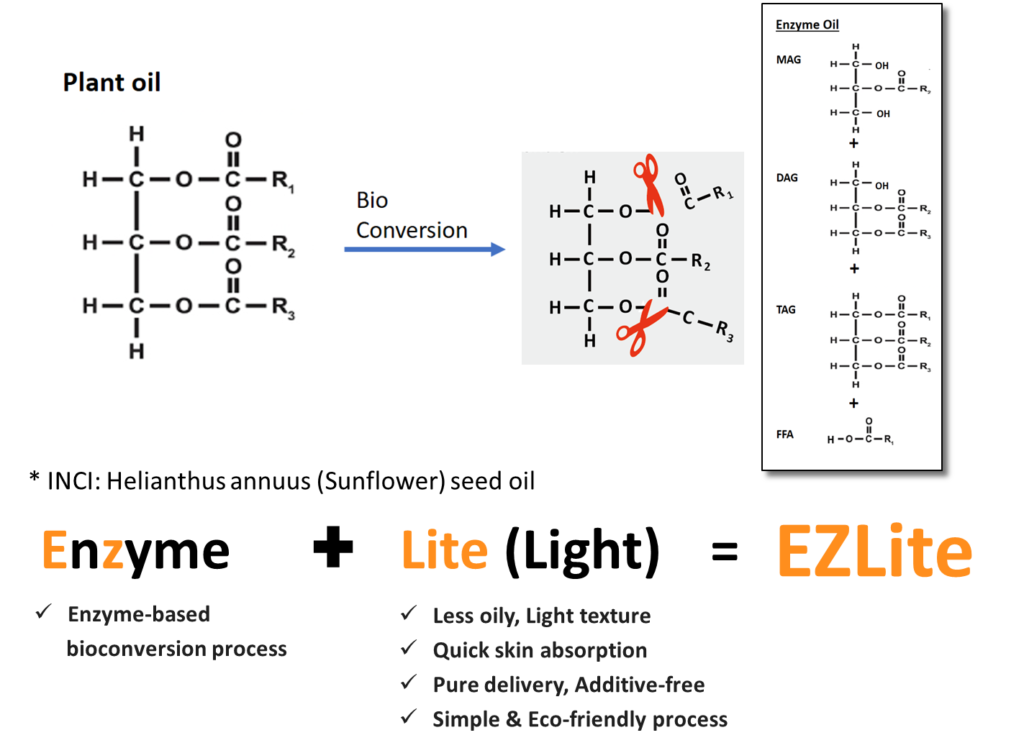 EZLite-SF는 Bioconversion 기술을 통해 분자량이 큰 TAG는 줄이고, 작은 MAG와 DAG의 비율을 높여 사용감이 더욱 가볍고 피부 흡수가 빠른 것이 특징입니다.