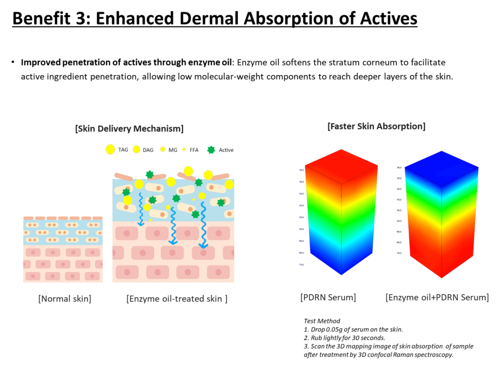이러한 빠른 피부 흡수는 유효성분이 더 깊고 빠르게 침투할 수 있도록 돕습니다. 실제로 PDRN 세럼과 EZLite-SF를 적용한 PDRN 세럼을 비교한 결과, EZLite-SF가 함유된 경우 확연히 더 높은 흡수 속도를 보였습니다. 이 모든 데이터는 3D Confocal Raman Spectroscopy 분석을 통해 검증되었습니다.