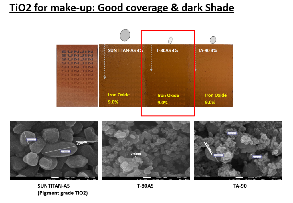 T-80시리즈는 커버력이 뛰어나며, 어두운 피부톤 표현이 가능합니다. 9% Iron oxide에 4% 각기 다른 TiO2 투입 시, T-80AS의 경우 커버력이 좋고 더욱 어두운 색상으로 발현되는 것을 확인 할 수 있습니다.