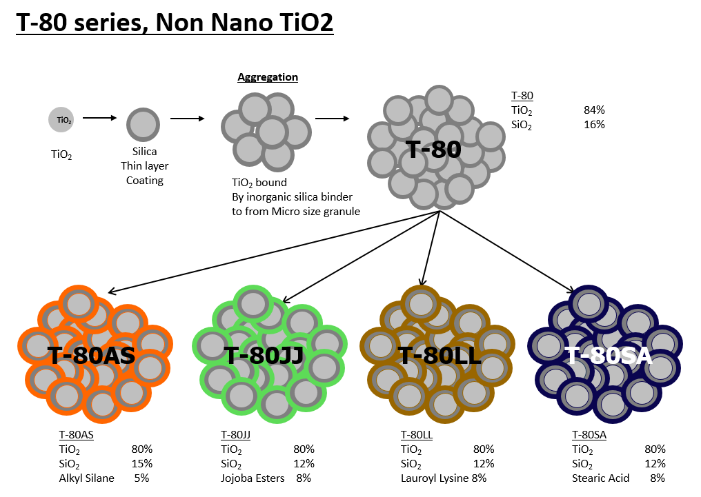 T-80시리즈는 T-80(무코팅), T-80AS(Alkyl Silane 코팅), T-80JJ(JoJoba Ester 코팅), T-80LL(Lauroyl Lysine 코팅), T-80SA(Stearic Acid 코팅) 제품으로 이루어져 있으며 처방에 따라 선택적으로 사용하실 수 있습니다.