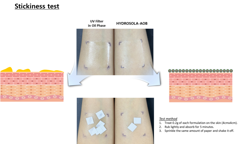더불어, HYDROSOLA-AOB는 다중층으로 감싼 유기 자외선 필터가 피부에 안정하게 도포되어 선크림 제형에 적용시 기존 유기 자외선 필터 기반 제형 대비 오일감이 적고, 보다 산뜻한 마무리감을 제공합니다.