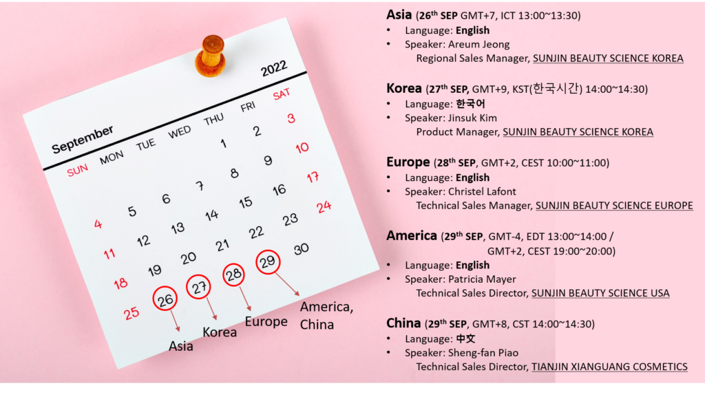 아래 표와 같이 3가지 언어로, 5종류의 시간대로 세계 각국의 고객들이 참여할 수 있도록 웨비나 프로그램을 구성하였습니다.