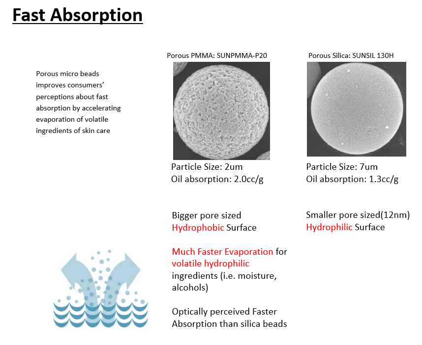 다양한 Micro bead를 사용하여 테스트 한 결과, 실리카에 Cetyl Alcohol을 코팅한 SUNSIL-OLEO20 및 다공성 PMMA인 SUNPMMA-P20 같은 표면이 소수성인 Micro bead를 사용하였을 경우 15초 안에 빠르게 처방이 흡수 됩니다.