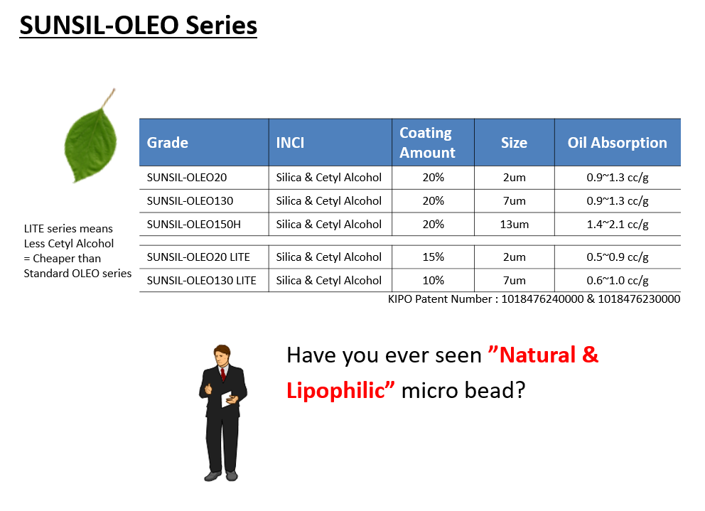 사실은 처방내 수분, 알코올 등 휘발성 성분이 증발되는 것이지만, 소비자들은 제품이 흡수가 빠르게 된다고 생각하는 경향이 있습니다. 이러한 소비자의 인식으로 인해 SUNSIL-OLEO 시리즈 같이 표면이 소수성인 Micro bead를 사용하는 것이 좋습니다.