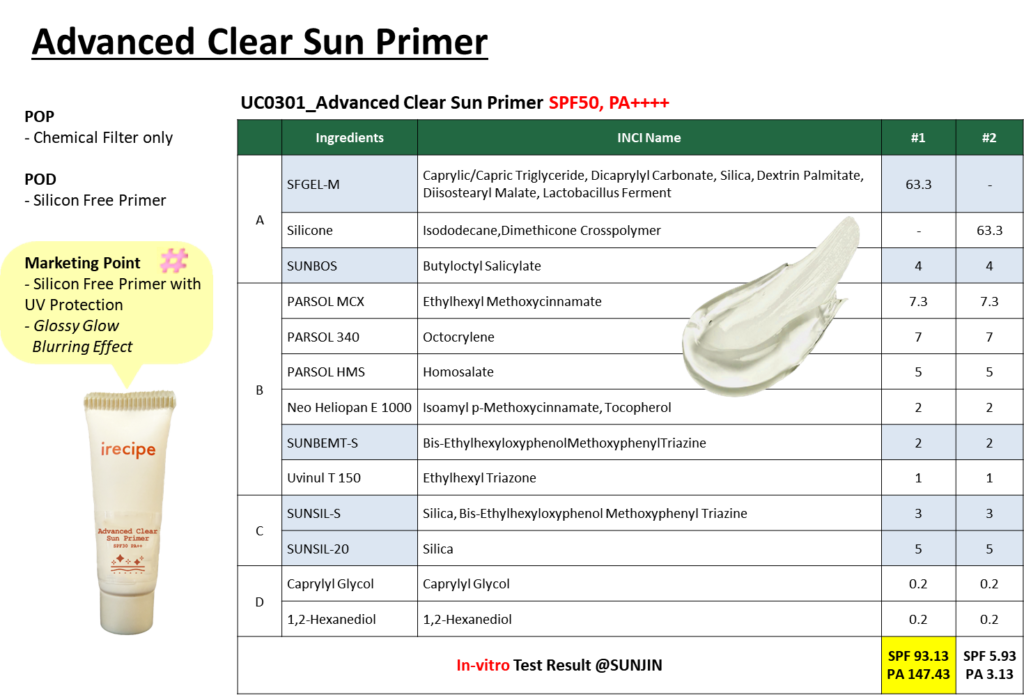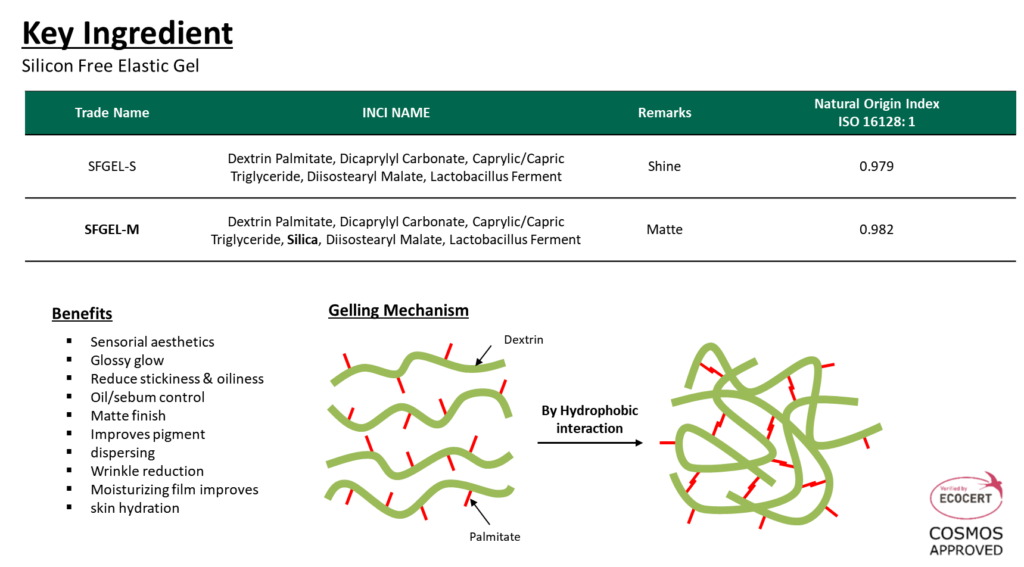선 프라이머에서 실리콘을 대체한 핵심 원료인 SFGEL(Silicone Free elastic Gel)은 클린 뷰티 컨셉에 부합하는 천연 엘라스토머로 유기 자외선 차단제의 도포 균일성을 높여 SPF/PA수치 안정화에 효과적으로 기여합니다.