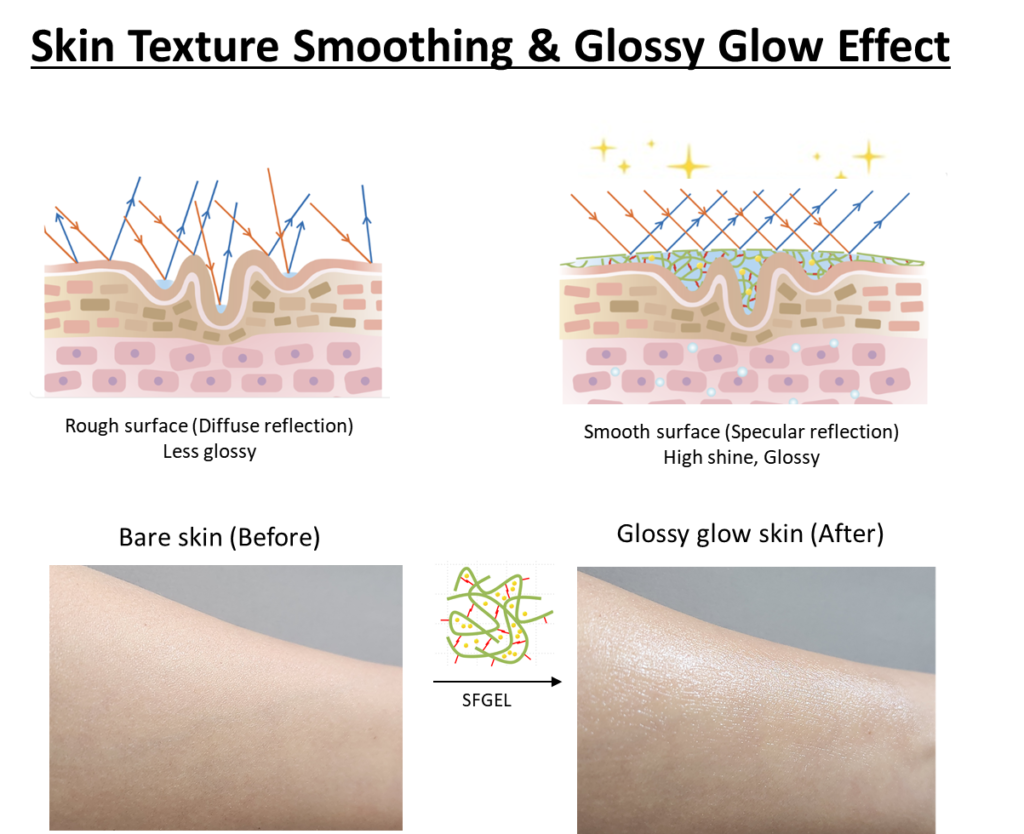 SFGEL은 프라이머 핵심 기능인 피부 요철 커버 및 메이크업 지속력 향상에 탁월할 뿐만 아니라 글로시 글로우(Glossy Glow)효과를 구현하고 벨벳처럼 부드러운 고급스러운 마무리감을 제공합니다.