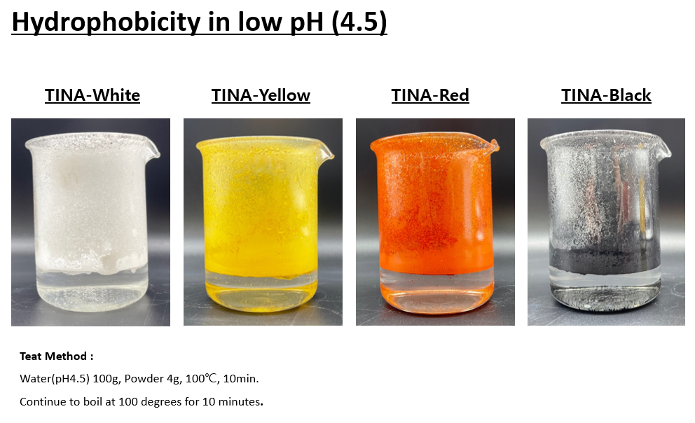 TINA 시리즈는 기존에 보편적으로 사용되던 Alkyl Silane코팅의 피그먼트들과 동등한 수준의 발수력을 가지고 있으면서, 클린뷰티 컨셉에 맞는 천연 코팅이라는 이점이 있습니다.