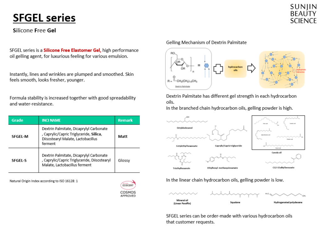 SFGEL 시리즈란? 클린뷰티 컨셉의 천연 엘라스토머 신제품으로, 다양한 유화 제품에 고급스러운 사용감을 나타낼 수 있는 실리콘 프리 컨셉의 제품 입니다.
