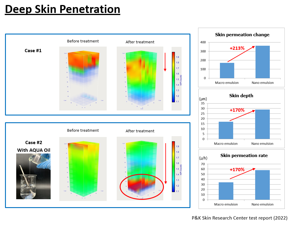 3D Raman Spectroscopy를 이용하여 이러한 Deep Skin Penetration 효과를 살펴보았습니다. AQUA Oil을 15% 함유한 처방이 보다 피부에 깊숙이 침투되는 현상을 관찰 할 수 있었습니다.