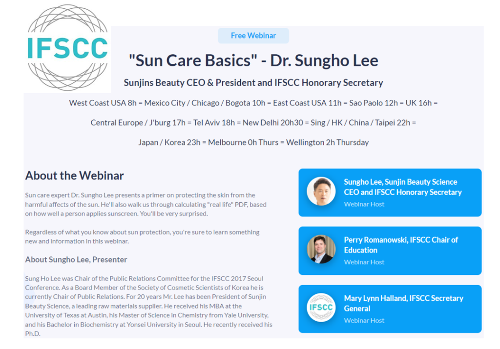 세계화장품학회 (International Federation of Societies of Cosmetic Chemists, IFSCC)에서 개최하는 자외선 차단 기초에 대한 웨비나에 초대 합니다.