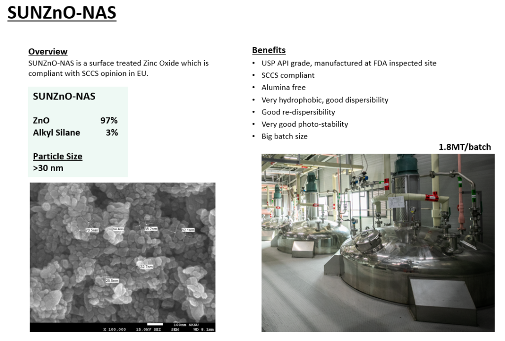 SUNZnO-NAS는 Triethoxy caprylylsilane으로 표면처리 된 30nm이상 사이즈의 징크옥사이드 입니다. Alumina Free 처방에 사용 가능하며, SCCS Opinion을 만족하여 유럽에서 사용 가능합니다.