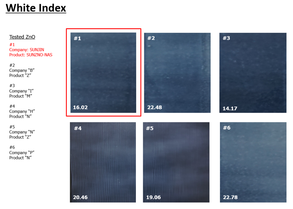 마지막으로 SUNZnO-NAS는 30nm이상의 작은 사이즈로 인해 투명성이 뛰어난 징크옥사이드 입니다. White index값이 타 제품보다 낮게 측정되어 보다 투명한 제품임을 알 수 있습니다.