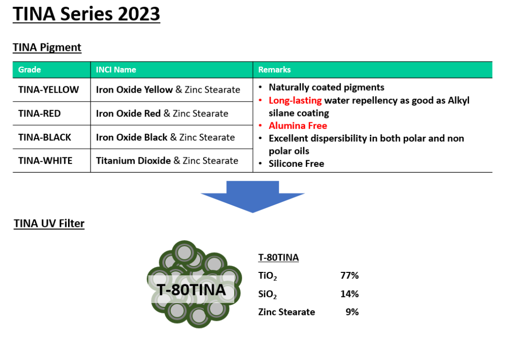 2022년에 런칭한 TINA Pigment 제품의 기술을 UV filter에 접목시켜 T-80TINA가 개발되었습니다. 이러한 T-80TINA를 활용하여 새롭게 개발된 제품이 T80TINA-70CC 입니다.