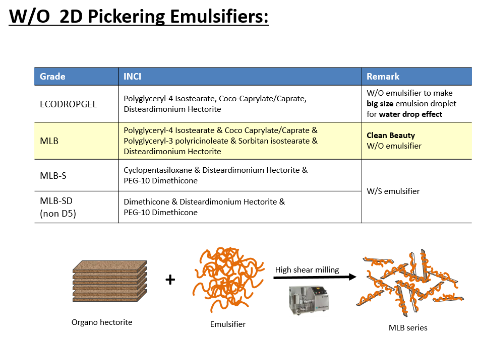 MLB는 PEG, PPG, Silicone free 처방을 위한 클린뷰티 컨셉의 원료로, 2차원적인 헥토라이트를 이용하여 유화력을 향상시킨 W/O 유화제입니다.