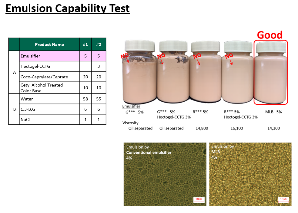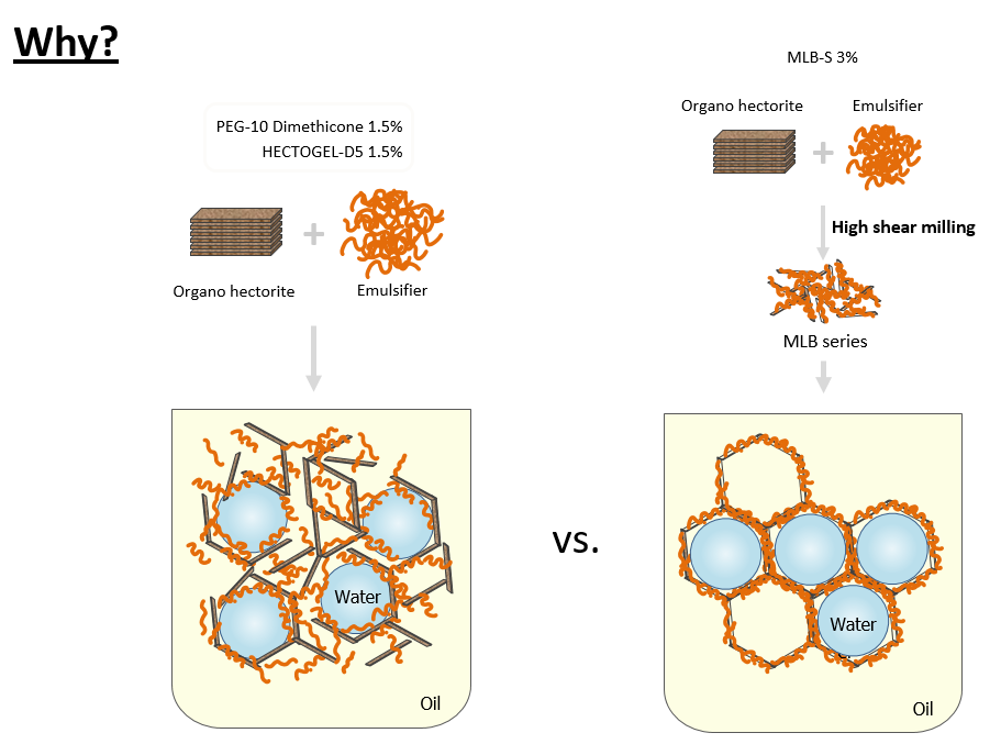 MLB가 유화력이 뛰어난 이유는 헥토라이트와 유화제가 함께 유화액적을 감싸 유화 안정성을 향상 시키는 일종의 Pickering Emulsifier로 작용하기 때문입니다.