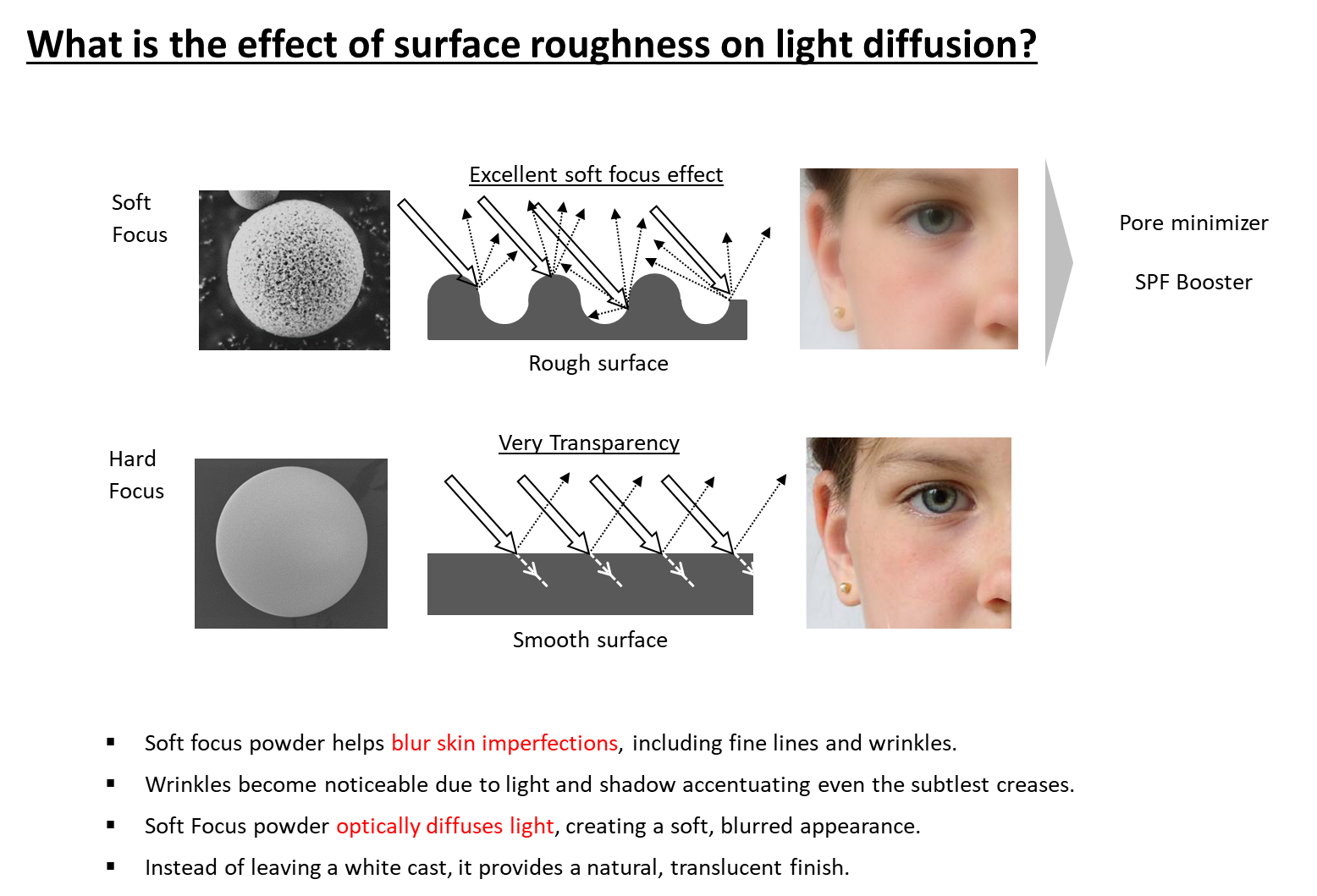 무기 자외선 필터 시스템에서는 자외선 차단 효율 전반을 보조적으로 향상시키고, 유기 자외선 필터 시스템에서는 산란된 자외선의 반복 흡수가 증가하여 SPF 부스터 효과가 더욱 크게 나타납니다.