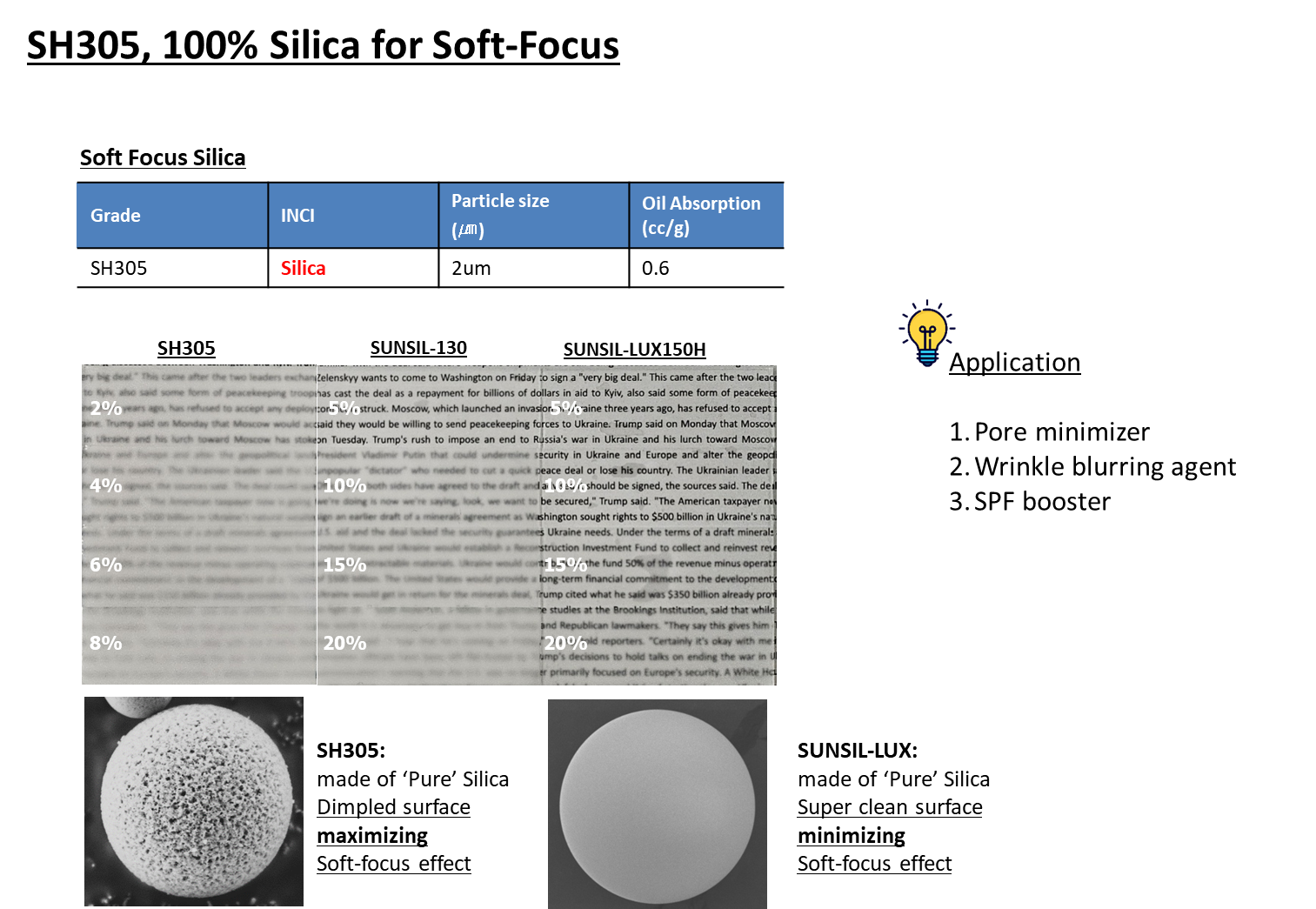반면 SH305는 실리카 표면의 미세구조를 비정형적으로 설계하여, 기존 실리카와는 차별화된 광학적·물리적 거동을 나타냅니다.