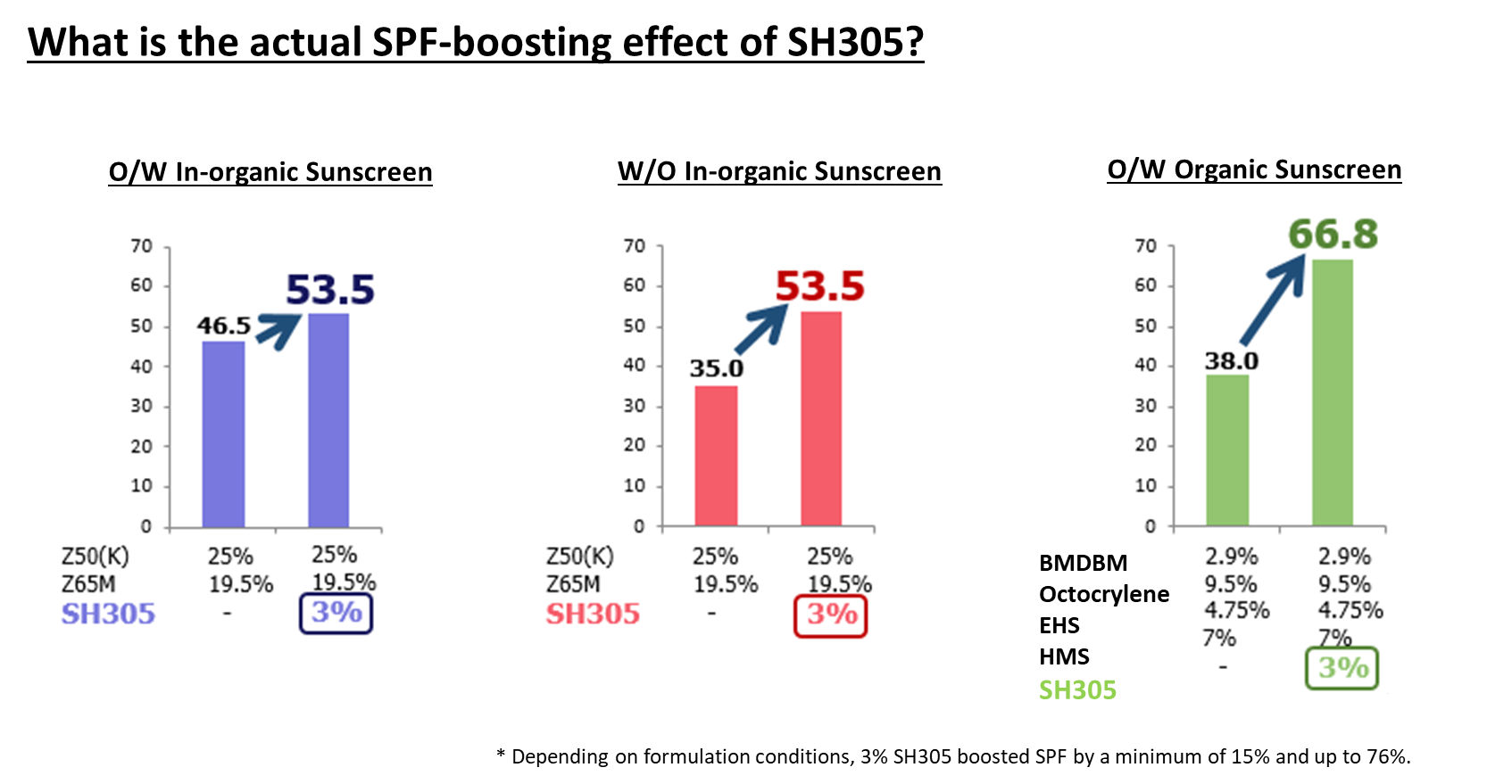 SH305는 다양한 자외선 차단 시스템에서 일관된 SPF boosting 효과를 확인하였습니다.