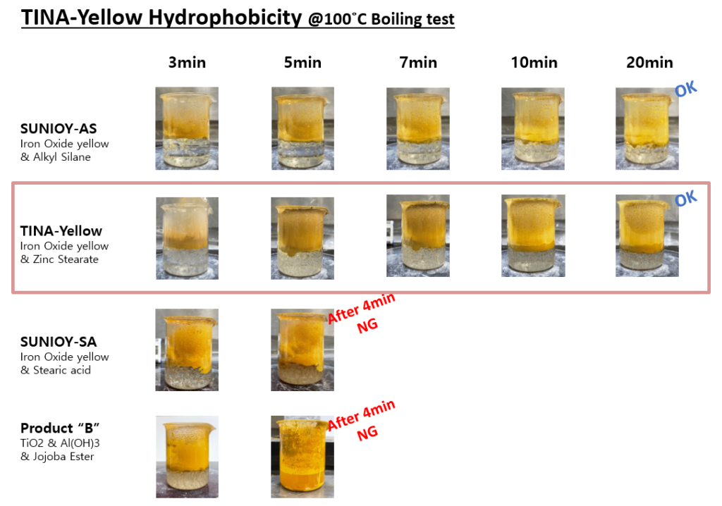 TINA 시리즈는 기존에 보편적으로 사용되던 Alkyl Silane 코팅의 피그먼트들과 동일한 수준의 발수력을 가지고 있으면서, 클린뷰티 컨셉에 맞는 천연 코팅이라는 이점이 있습니다.