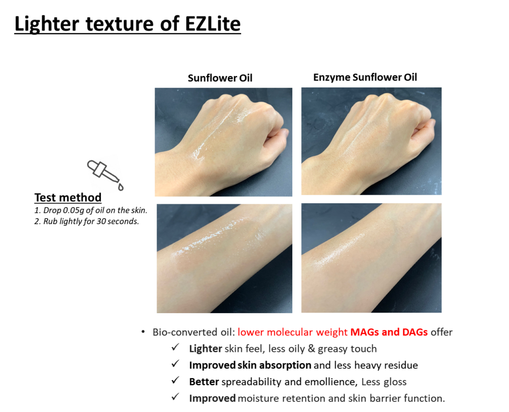 다음으로 출시한 주요 제품은 효소 기반 Bioconversion 기술을 활용한 Enzyme oil, EZLite입니다. EZLite는 MAG, DAG, TAG의 분자 구조 중 낮은 분자량의 MAG와 DAG의 비율을 높인 제품으로, 산뜻한 사용감과 빠른 피부흡수도를 제공합니다. 또한 다양한 에몰리언트와 함께 사용했을 때 점증되는 효과가 있어, 천연 점증제로 활용하실 수 있습니다.